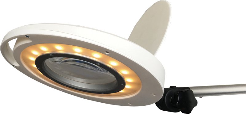 Lámpara LED de luz fría con lupa de 5 dioptrías y ajuste de brillo. Viene con una base de 5 ruedas